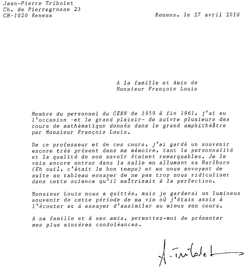 Nous nous souviendrons de sa grande compétence, de son exactitude dans la réalisation des pièces et du grand soin apporté à l’exécution des multiples projets auxquels il a participé tout au long de sa carrière au CERN. D’autre part, il a toujours su manifester pour son travail beaucoup d’engagement, de disponibilité et de fierté.